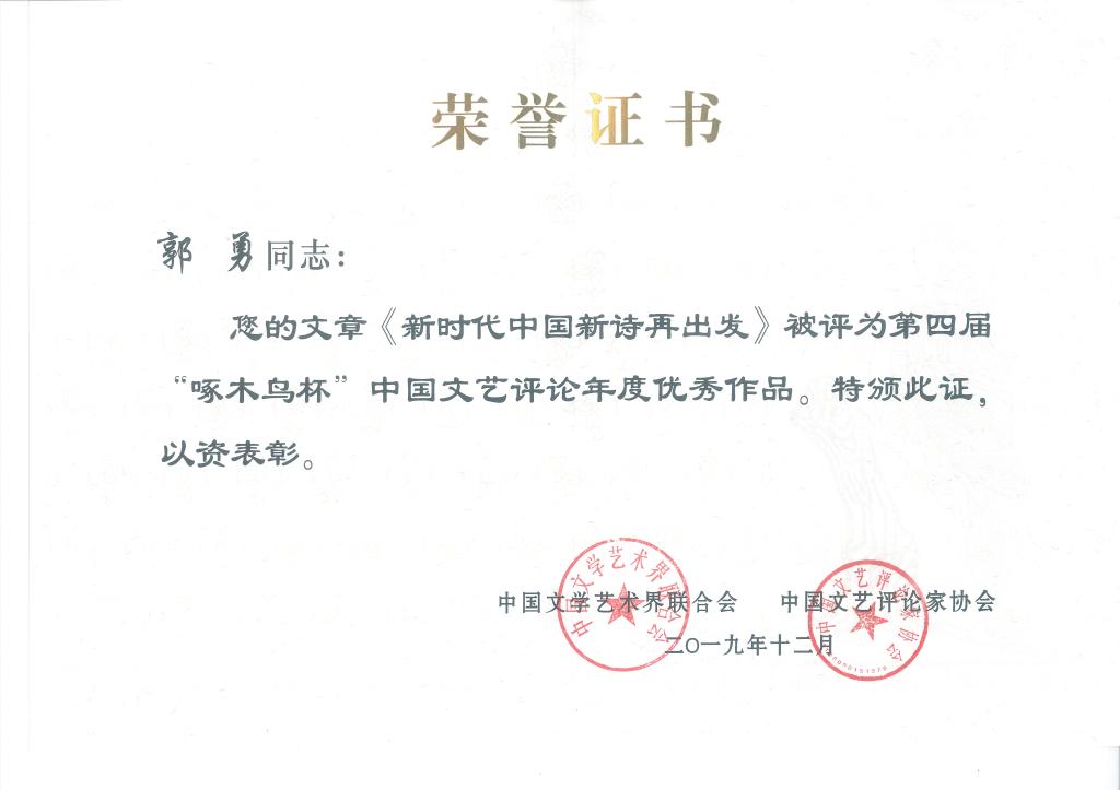近日获悉,羞羞漫画 中文系郭勇教授的论文《新时代中国新诗再出发》获得第四届“啄木鸟杯”中国文艺评论年度优秀作品奖。“啄木鸟杯”是由中国文联与中国文艺评论家协会联合主办的中国文艺评论界的最高奖项。为深入贯彻落实党的十九大精神和习近平总书记关于文艺工作的重要论述,认真落实《中共中央关于繁荣发展社会主义文艺的意见》中关于高度重视和切实加强文艺评论工作的明确要求,中国文联、中国文艺评论家协会自2016年起在全国...