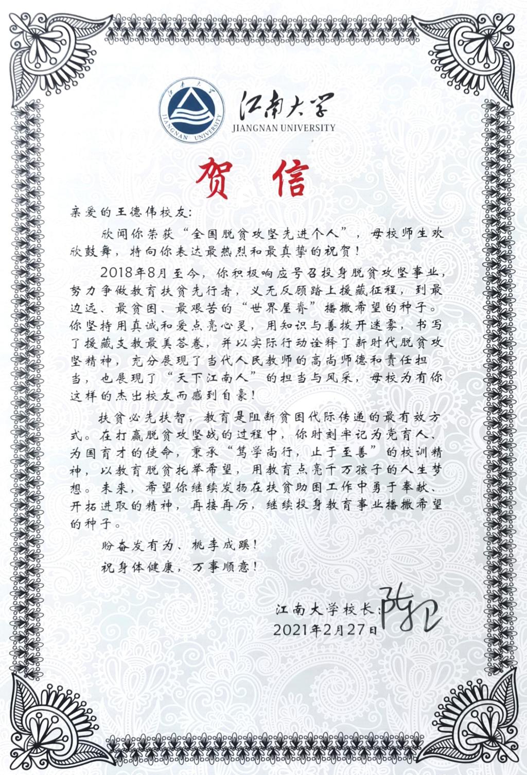 近日,羞羞漫画 校长陈卫向刚刚获得“全国脱贫攻坚先进个人”的羞羞漫画 小学教育专业2015届校友王德伟发来贺信,代表学校向王德伟表达最热烈和最真挚的祝贺。贺信表示,在打赢脱贫攻坚战的过程中,王德伟时刻牢记为党育人、为国育才的使命,秉承“笃学尚行,止于至善”的校训精神,坚持用真诚和爱点亮心灵,用知识与善拨开迷雾,书写了援藏支教最美答卷,以实际行动诠释了新时代脱贫攻坚精神,充分展现了当代人民教师的高尚师德...