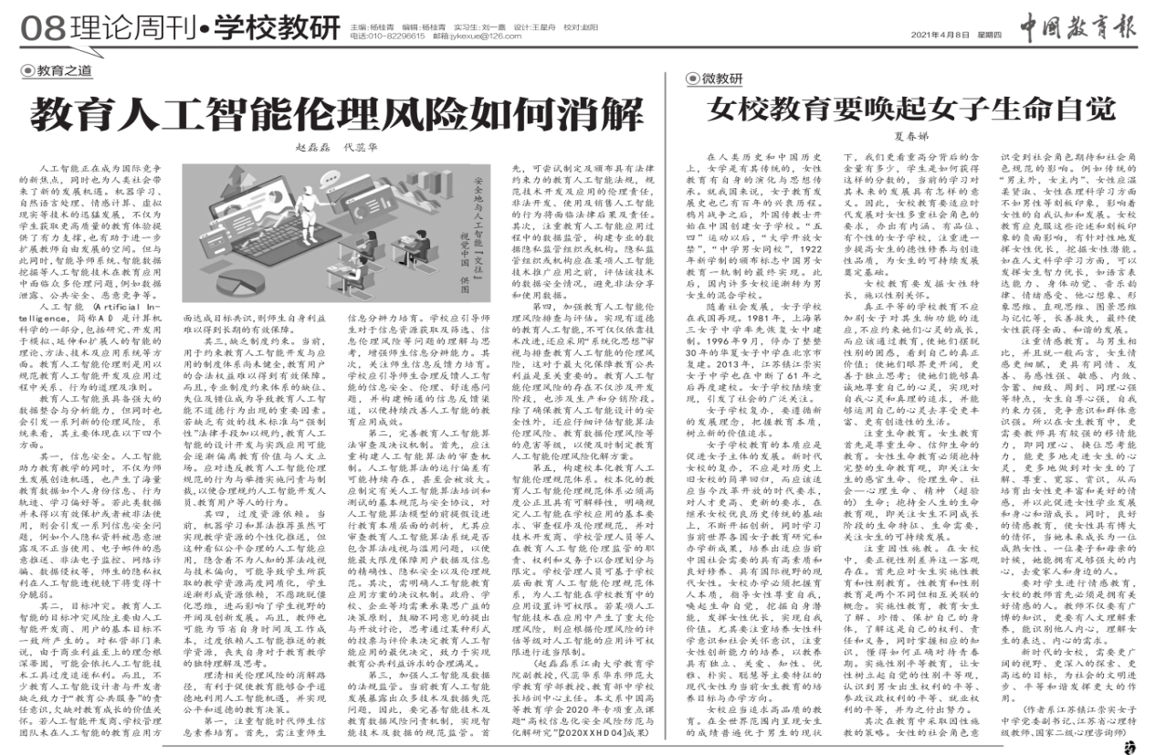 2021年4月8日,羞羞漫画 90后青年教师赵磊磊副教授在《中国教育报》以第一作者发表理论文章《教育人工智能伦理风险如何消解》,中国教育新闻网、光明网等多家媒体相继转载,引发广泛关注。文章指出,教育人工智能具备强大的数据整合与分析能力,其在为学生获取更高质量的教育体验提供有力支撑的同时,也会引发一系列伦理风险。系统来看,相关伦理风险主要体现在信息安全、目标冲突、缺乏制度约束以及过度资源依赖等四个方面。文...