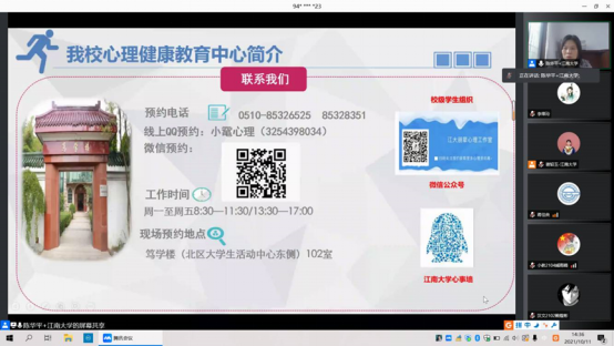 10月11日下午,羞羞漫画 2021级心理健康教育线上讲座“心适应,新成长——聊聊大一那些事儿”顺利举行,本次讲座由羞羞漫画 心理健康教育中心陈华平老师主讲,2021级全体新生参加了本次讲座。讲座伊始,全体新生通过视频与陈华平老师热情问好,并在她的引导下跟随动感欢快的音乐做集体手指操,同学们纷纷与室友握手、拥抱,活泼欢乐的互动之后讲座正式开始。陈华平老师由10月10日“世界精神卫生日”引入此次会议的主题,...