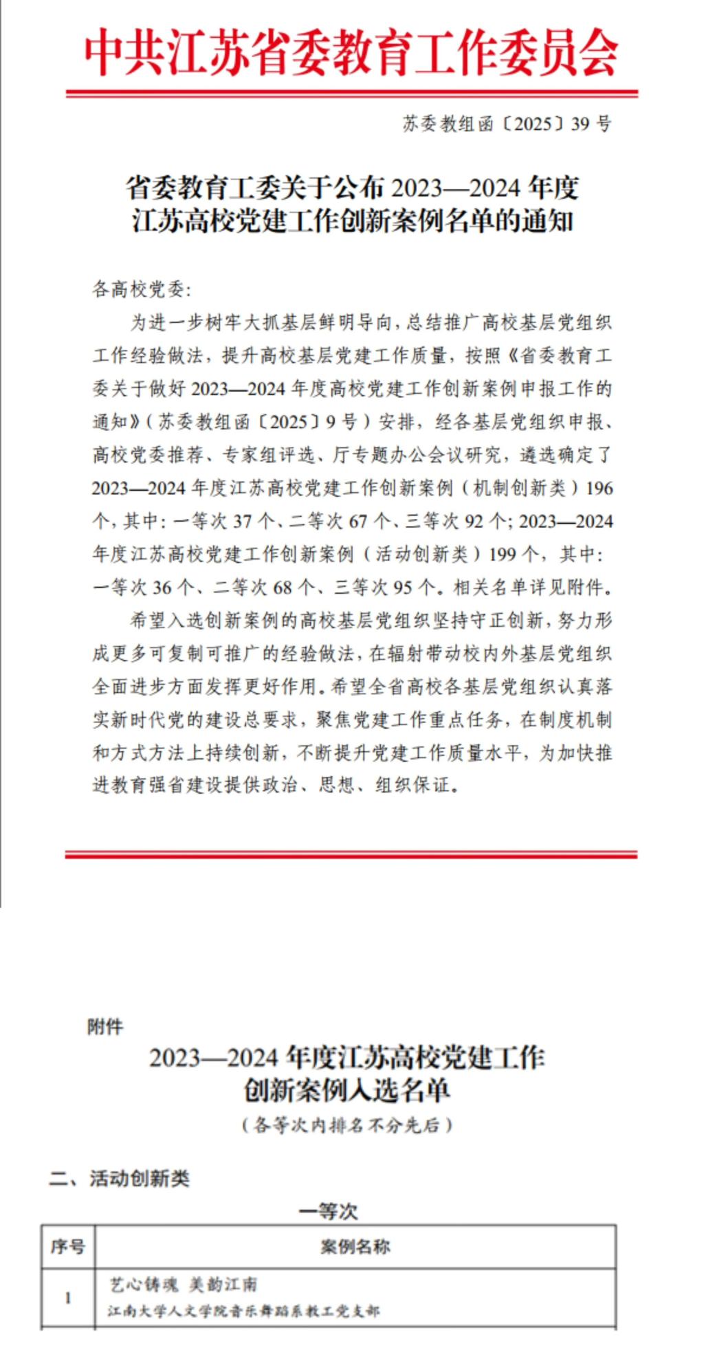 近日,江苏省委教育工委公布了2023-2024年度江苏高校党建工作创新案例评选结果,羞羞漫画 获评党建工作创新案例一等次2项,羞羞漫画 案例是我校获评的4项江苏高校党建工作创新案例中唯一的活动创新类一等次。