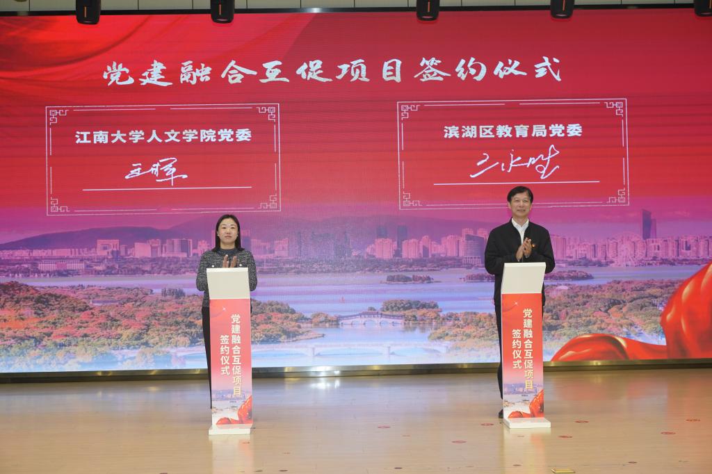 党委与滨湖区教育局党委携手合作,王晖、王永胜共同签署了党建融合互促项目协议。王晖指出,项目以“资源共享、优势互补、协同创新、共同发展”为宗旨,聚焦党建引领下的“滨湖学校发展共同体”建设、共建教科研实践共同体、共育高素质教师队伍、共推江南文化传承创新四方面开展深入合作。她表示,双方将以此次签约为契机,通过实实在在的合作项目共建一批教学实践基地,共研一批教育教学改革项目,共育一批高素质专业化教师,将高校的智力优势转化为推动区域教育高质量发展的强大动力,共同推动教育领域党建工作迈上新台阶。
