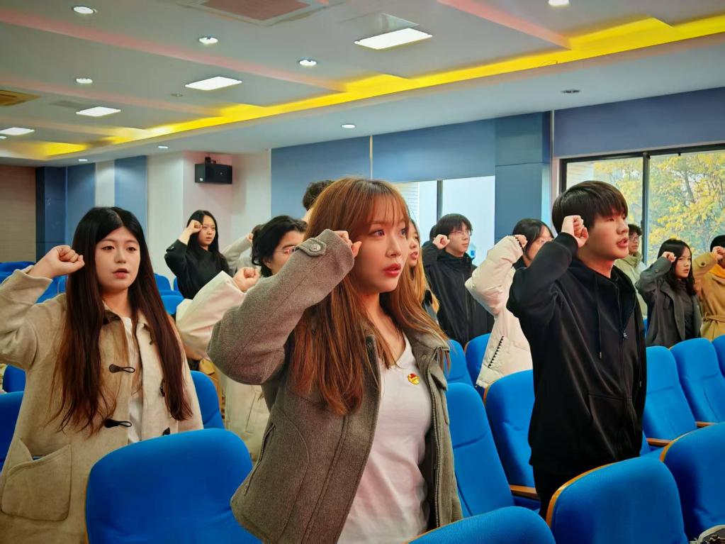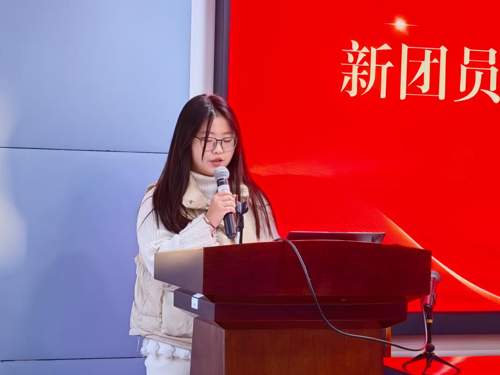 2025年下半年新团员名单》。在颁发团员证与团徽环节,与会嘉宾共同为新团员代表颁发团员证并佩戴团徽。全体新团员在邓昌海的带领下,面向团旗,庄严宣誓:“我志愿加入中国共产主义青年团……”铿锵誓言回荡会场,彰显出新时代青年坚定理想信念、矢志奋斗的决心。