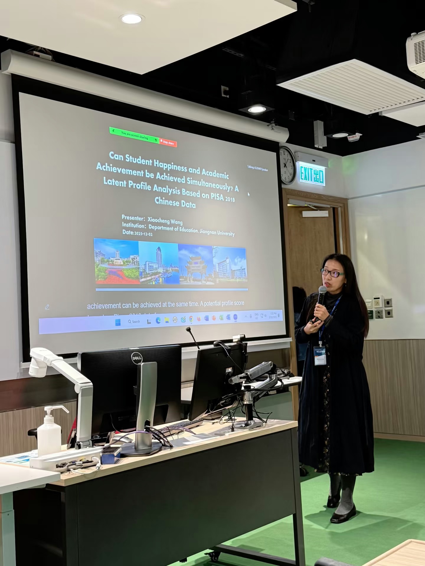 教育系王晓诚副教授应邀参加大会,共同探讨生命教育与幸福感领域的最新研究成果。香港当地时间12月2日下午1点,王晓诚参加了第N分会场的小组会议,会议主题为:“生命与价值观教育对积极生命价值观和幸福感的影响”(Impact of Life and Values Education on Positive Life Values and Well-Being)。王晓诚就该主题做口头报告:“学生幸福和学业成就是否可以兼得?基于PISA2018中国数据的潜在剖面分析”。该报告基于PISA2018中国四省市学生数据,使用“以个体为中心”的分析技术——潜在剖面分析,探讨了主观幸福感和学业成就在不同个体身上的组合情况,同时探讨了个体、家庭、学校层面的一系列因素对学生剖面类型的预测效果。潜在剖面分析识别出四类群体:“不满意的中等生”(生活满意度偏低/学业成绩中等)、“满意的中上游学生”(生活满意度较高/学业成绩中上水平)、“最不满意的中等生”(生活满意度最低/学业成绩中等)以及“满意的差生”(生活满意度最高/学业成绩最低)。这一发现揭示了传统的“以变量为中心”的研究难以捕捉的群体异质性现象,为学生幸福和学业成就的均衡提升提供了重要启示。研究还发现,学生个体层面(例如,竞争性动机、阅读态度、成长型思维、心理韧性)、家庭层面(例如,家庭社会经济地位、父母情感支持)、学校层面(例如,教师支持、教师适应性教学、教师的认知激活策略、教师教学热忱、课堂纪律氛围、学校归属感)相关变量对我国青少年剖面类型从属具有显著预测作用。