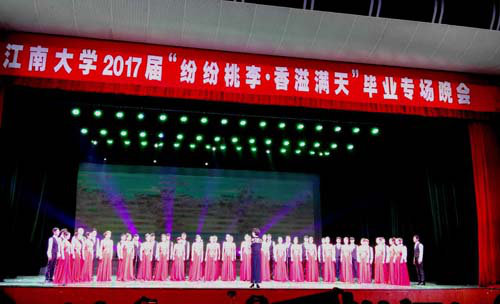 度过的美好日子和留下的点滴记忆;《依依.绽放》以二胡重奏《新赛马》的激昂曲调开始,奏出了江大学子积极向上的精神面貌,以舞蹈《雁南飞》结束,讲述了革命年代的青年人为理想而战的赤子之心与生离死别的情感波澜;《漫漫.飘香》表达了即将离校的学子对江大的依依不舍之情。