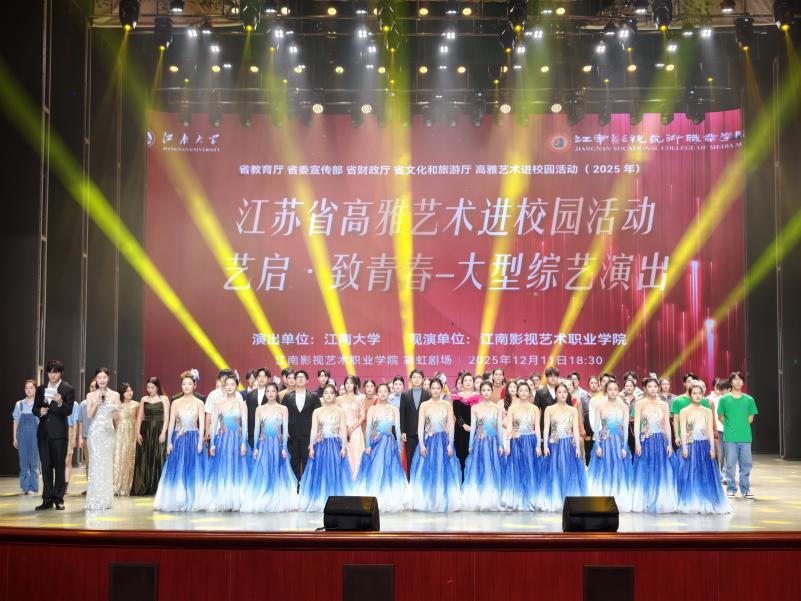 12月11日晚,2025江苏省高雅艺术进校园“艺启·致青春”大型综艺演出在江南影视艺术职业学院温情上演。江南影视艺术职业学院时尚设计学院副院长贾曚、团委副书记周蔚;羞羞漫画