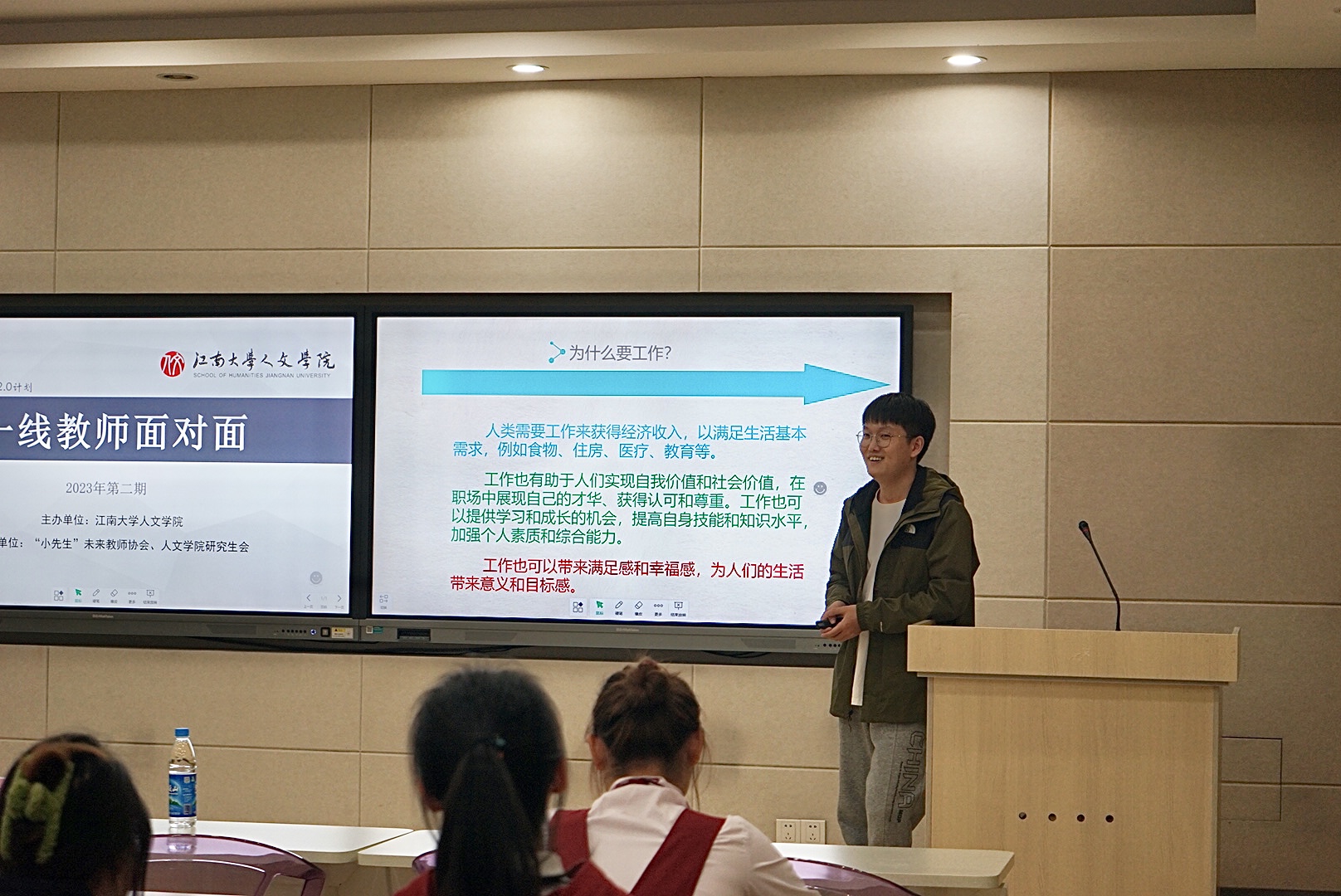 互动提问环节,同学们积极提问,两位教师耐心为同学们解思想之困。借助一个个生动的教育教学案例,将学生切实带入到一线教师的场域中,为学生接下来的学业发展及专业发展提供了崭新的驱动力。