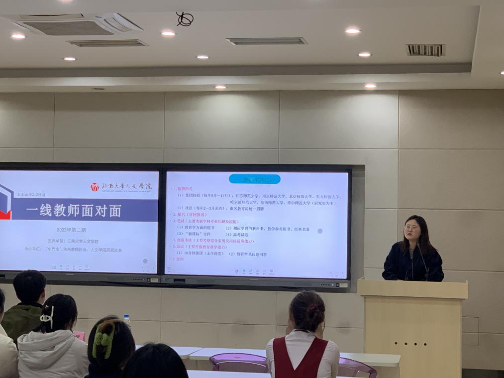 陈悦悦老师围绕青年语文教师的成长之路,结合自己的教育教学经历,分别从教师招聘、语文教师专业发展、班主任工作方面分享了自己的从教心得。在教师招聘方面,陈老师重点介绍了招聘形式、笔试前期准备及面试技巧;在语文教师专业成长方面,陈老师针对构建“语文人的课堂、语文味的课堂”提出了自己的经验探索,如建立学生学习档案袋、每日学情分析反馈等,持续完善教学过程与方法;最后,对于班主任工作,陈老师通过一系列真实鲜活的班级管理事例的呈现,探讨了润物无声的教育方式。这些经验精辟入理,给人启迪,解答了同学们在就业起点的各种疑惑。