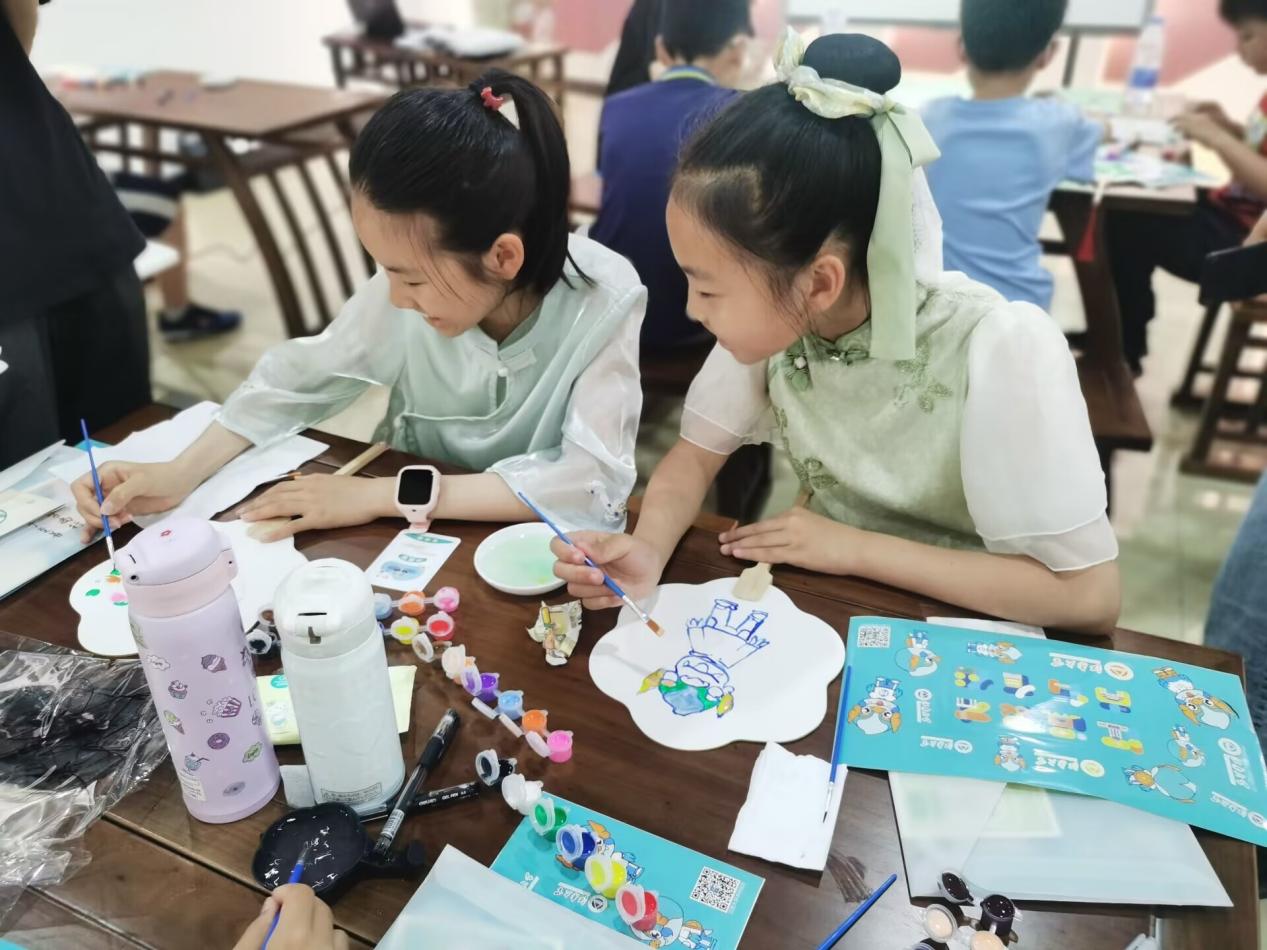 田家炳楼陈列展览室,本期活动的第二个环节“诗意江南,巧画罗扇”在这里进行。于祥涛、王晓昀通过“解诗词”、“辨节气”、“诵诗词”三个环节的讲述,带领小朋友们在诗词中寻觅夏日、体味文化。初夏胜景,诗词共赏,现场师生、家长们随着主讲人的讲解一起品读、赏析,在诗词中感受夏日的美好。李同欣、胡高菡带领小朋友们在游历了江南夏景、诵读了夏日诗词之后,拿起彩笔,在中国传统工艺品团扇上,绘出自己心里的夏日风光。在赠书环节中,小朋友们写下祝福与问候,这份爱心将会在暑期由羞羞漫画