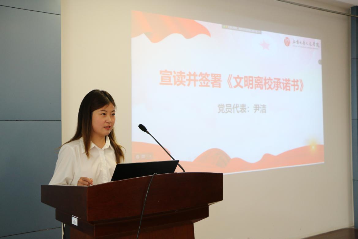 随后,毕业年级辅导员邓昌海带领毕业生党员认真学习并签署了《毕业生党员须知》。由党员代表尹洁宣读《文明离校承诺书》,在场党员签署承诺书。最后,党建辅导员张雅静就毕业生党员组织关系转移工作要求和注意事项为大家做讲解说明。