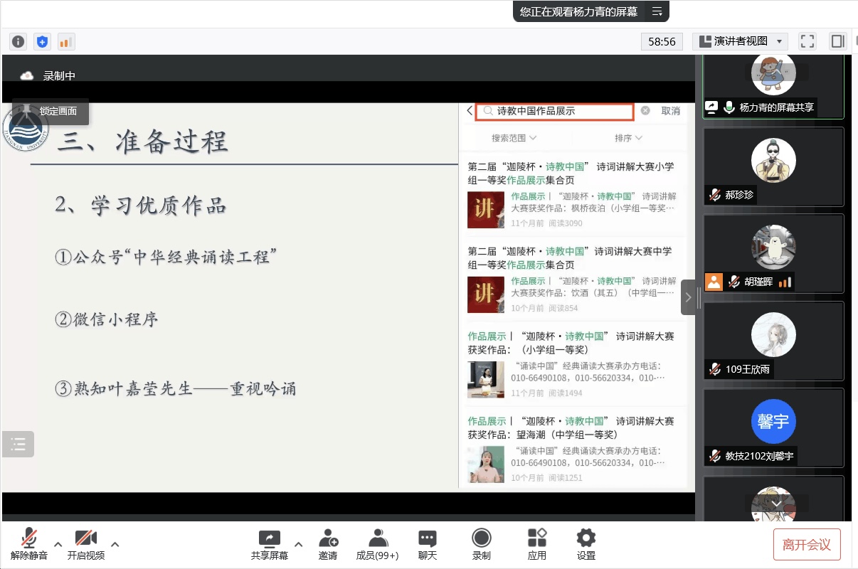 第十四期真人图书馆——中华经典诵写讲备赛经验分享会在线上顺利举行,会议邀请了在第三届中华经典诵写讲大赛“诗教中国”诗词讲解大赛中荣获一、二、三等奖的何明昭、杨力青、田佳平、陈蔚祺四位同学分享备赛经验,200余多名学生线上参加。