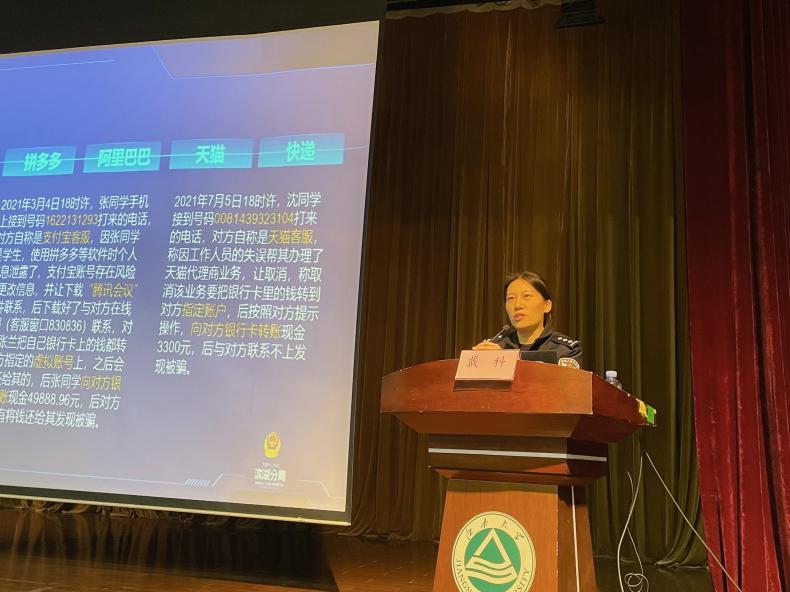 讲座伊始,戴警官从电信网络诈骗的定义、产业链、基本特征三个方面向同学们做了详细介绍,重点揭露了网络诈骗作案过程的非接触化、作案手段的智能化、作案空间远程化等特点。随后,戴警官结合典型案例,分析了在学生群体中高发的诈骗类型,向同学们介绍了几种典型的网络诈骗手段以及识别防范电信网络诈骗的方法技巧。讲座过程中,戴警官还特别强调,大学生要注重网络文明素养的提升,文明上网,不信谣,不传谣,引导同学们理性发声,争做积极健康向上的新时代好网民。
