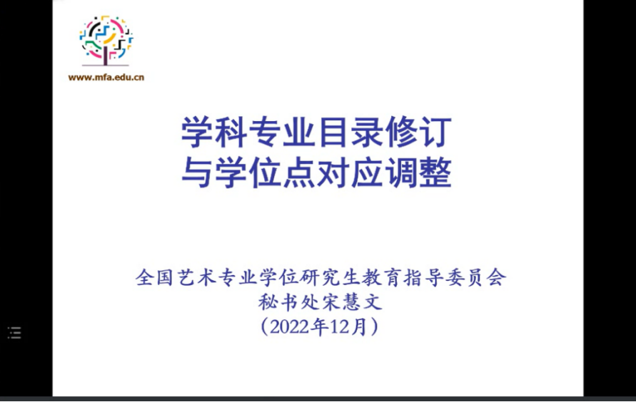 宋慧文秘书长首先指出本次艺术学科专业目录修订工作是在国务院学位委员会办公室组建的“文、史、哲、艺”学科专家论证组领导下,经过深入调研,广泛听取全国各培养单位、国务院学科评议组和全国艺术专业学位研究生教育指导委员会专家意见,形成最终发布的艺术学门类学科专业设置调整方案。