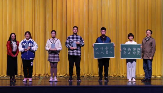 随后,新生代表小教2103班金玮滢发言。她展望了未来四年精彩的大学生活,并表示立志成为既有学习精神,又有济世情怀的新时代大学生。紧接着,副院长王芳、副院长杨晖为学生代表赠书《人生十论》,授师范生小黑板,希望同学们在阅读中探索人生本真、在实践中提升专业技能。