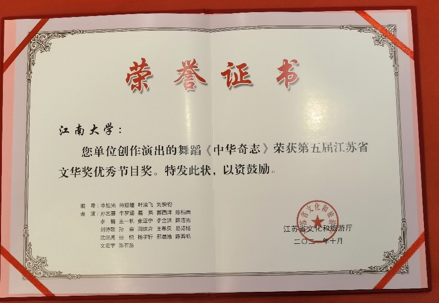 舞蹈系申旭光、符姗姗、叶凌飞及刘悦钧四位老师创作的舞蹈作品《中华奇志》,历经半年的不断打磨,最终在全省117个节目中脱颖而出,获得江苏省“文华优秀节目奖”。本次参赛的队伍均来自省内专业院团及艺术院校。该奖项是江苏省人民政府批准设立的省级专业艺术竞赛政府最高奖。