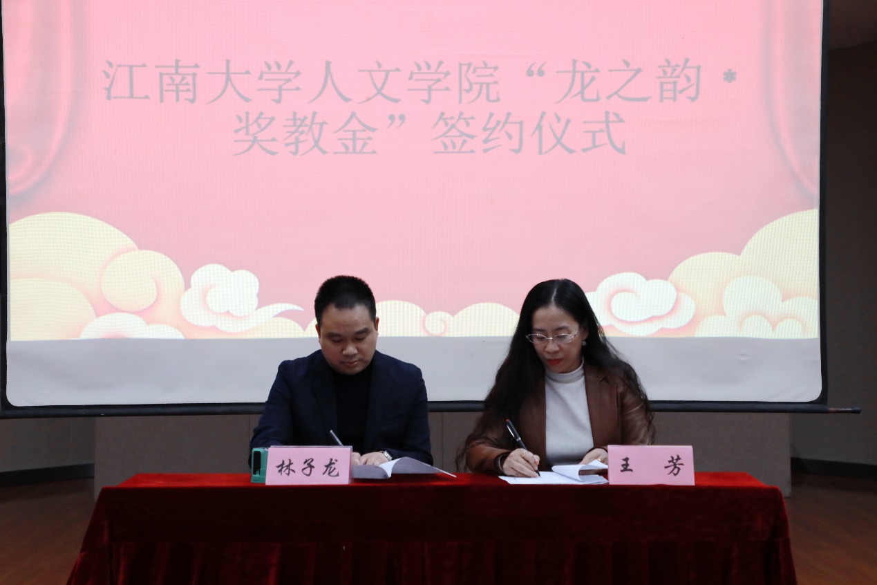 此次聘任仪式上,王芳代表学院与龙之韵文化发展有限责任公司董事长林子龙签订了“龙之韵”奖教金的协议书,为学院各项活动的举行提供了更多的社会支持。