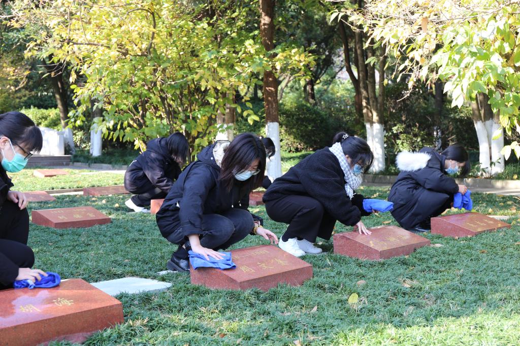 悼念仪式结束后,在人民英雄纪念塔前,新发展的学生党员进行了隆重的入党宣誓,“我志愿加入中国共产党……”,铿锵恢宏的誓词,久久激荡在每位党员师生的心中。汉语1903班廖闻渊同学代表全体新党员进行发言,她说到:“我们来到这里既是在追忆历史缅怀先辈,也是在学习成长,学习“敢想、敢做、敢为天下先”的精神和勇气。身为青年党员,我们要矢志不渝地坚持党的全面领导,听党指挥,以强烈的忧患意识和高度的民族认同感,自觉把爱国之情转化为报国之行,努力为世界和平发展、祖国的繁荣富强、人民的美好生活需要做出自己的贡献!”接下来,全体学生党员进入烈士史料陈列馆进行参观学习,园区讲解员为大家讲述了40余位无锡籍烈士的光辉事迹和无锡地区的党史故事,号召同学们弘扬先烈不朽的革命精神,传承红色基因。参观学习结束后,全体同学为烈士陵园内的一百余个墓碑进行擦拭,并对墓碑前的杂草和落叶进行清理。