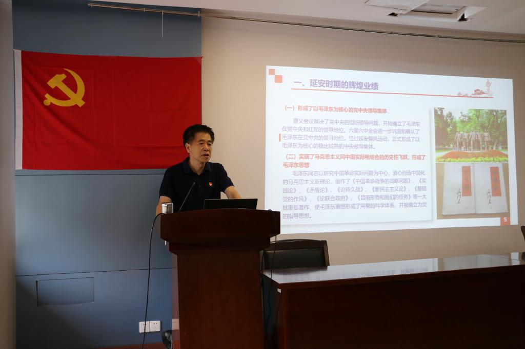 入党宣誓仪式后,陈明选教授为与会党员作了《延安精神的内涵与时代价值》的主题报告。陈明选教授结合自己在革命圣地延安20年的工作经历,从延安时期的辉煌业绩、延安精神的内涵特质、延安精神产生的条件以及延安精神的时代价值四个层面娓娓道来。他强调延安精神是我们党宝贵的财富,对于建设新时代中国特色社会主义事业、实现中华民族伟大复兴具有重大意义。