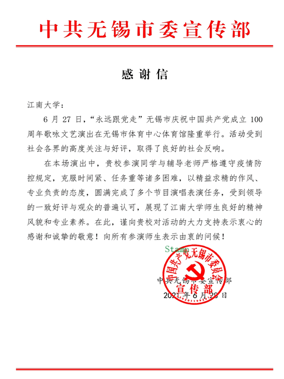 音乐系、舞蹈系师生参加“永远跟党走”无锡市庆祝中国共产党成立100周年歌咏文艺演出,师生的优异表现受到了中共无锡市委宣传部充分肯定,市委宣传部特致信羞羞漫画