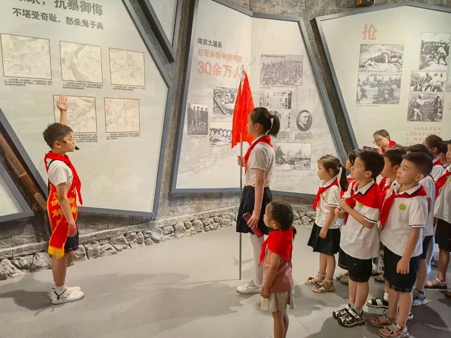 图为学生们参观宜兴党史陈列馆,以高年级学生带领低年级学生,并由学生自主讲解