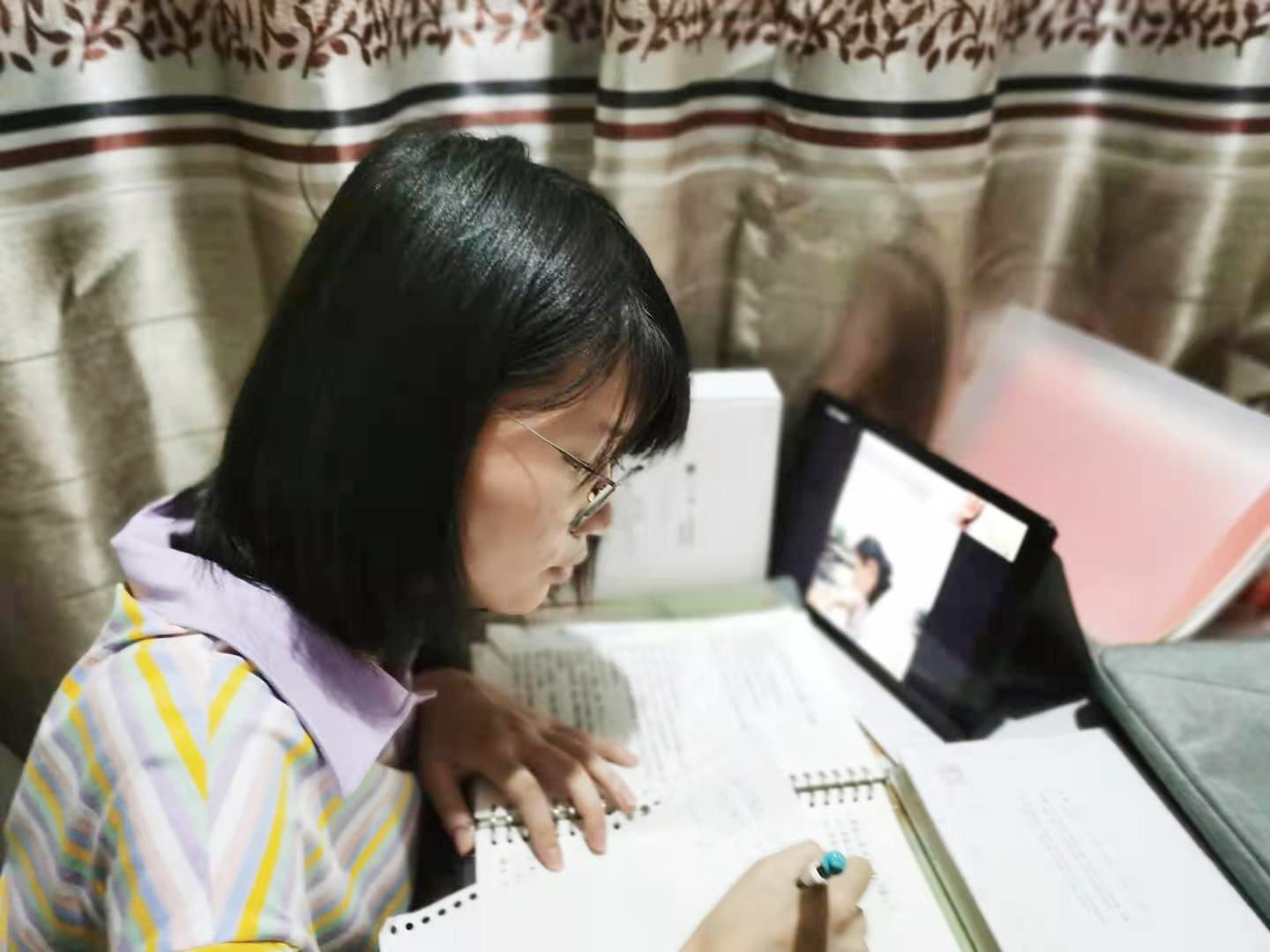 图为学生们正在放映室观看红色电视剧