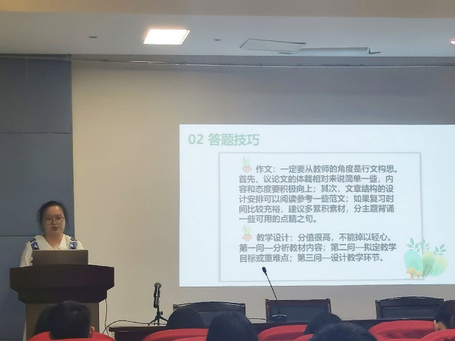 最后,来自汉语1705班的任婕同学向大家分享了高中语文科目教资考试的经验。“背模板不如看真题,作文标新立异不如内容积极向上、丰富多彩。”她表示,作答作文题时正确使用平时积累的素材、字数达标、设计出彩标题,这些方法都对于提高分数有很大的帮助。