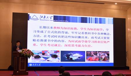 陈明选教授做了题为《智能时代教学范式的转型与重构》的主题报告。介绍了教学范式转型问题提出的背景,指出由于信息化发展给教学带来的问题在传统模式下得不到满意解决,原有的教学范式难以适应当代的教学实践。据此,他提出重新定位智能时代的育人目标,强调围绕核心素养,培育可持续发展能力。教学范式的转型目标应是通过深度学习提升核心素养,需要注意以下几点:抓住学习的本质内涵——理解:围绕核心素养把握教学设计的基本要素;基于互联网思维再造学与教的模式;运用智能技术构建学习环境,将评价贯穿于深度学习的过程中。最后,陈教授表明智能时代的教育虽然技术是重要的推动力,但教学必须回归“育人”的原点和本真。陈教授的报告引起了较大反响。