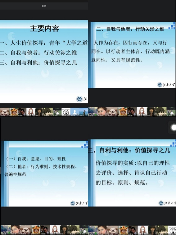 包老师首先从青年的人生价值追寻是青年的大学之道入手,详细阐述为何要追寻人生价值。面对人类自身的种种局限以及所面临的生存困境,追寻人生价值,使得人与自然与社会达到一种自然的和谐。他引用杨国荣先生的话,形象地讲述了人的行动对自己与他人的重要性。包老师讲到人的行动关涉两个方面——自我与他者。人类通过自我意愿、目的、理性来获得自我认可的同时,也要遵守行为准则来规范其行为。结合在这场抗击疫情的战斗中涌现的青年人响应号召,积极投身各项防疫工作的感人事例,包老师从“自利与利他”方面入手,详细阐述了价值探寻的实质——青春最大的价值莫过于个人成长与祖国进步同向而行。