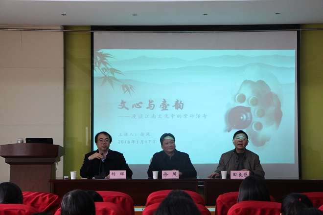 多了一份联系、一份期待一份特殊的情感。接下来,徐风先生作题为“文心与壶韵——漫谈江南文化中的紫砂传奇”的文化讲座。徐教授从紫砂的悠久历史讲到壶与茶的相依相生关系,再到紫砂里的文化底蕴,步步深入、引人入胜。他指出,紫砂壶的气韵能传达出制壶者独一无二的心胸灵魂,是一种文化的共鸣,它作为传统文化精髓传承的一个重要媒介,融陶文化、茶文化、诗文、书画等于一身。此外,徐教授还介绍了供春、陈明远、陈鸿寿、邵大亨、顾景舟等文人,带大家一起见证了紫砂的传奇。