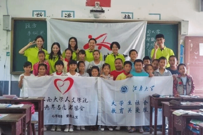 支教团的志愿者们和南京师范大学的同学们,一一向孩子们介绍了自己,并与孩子们进行了互动与交流。
