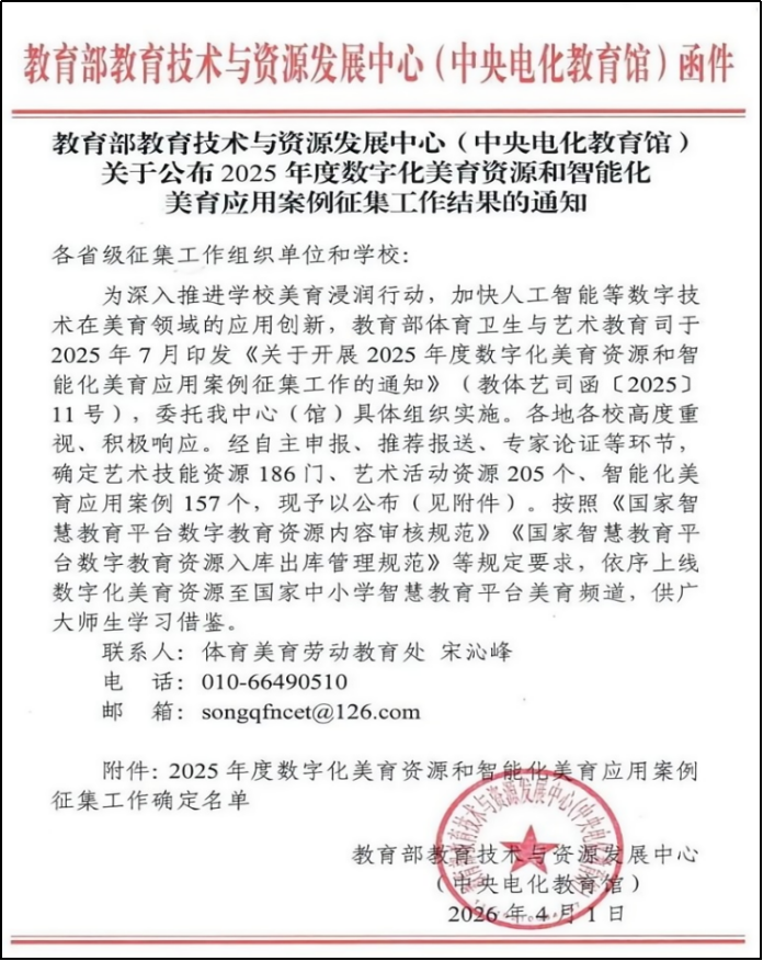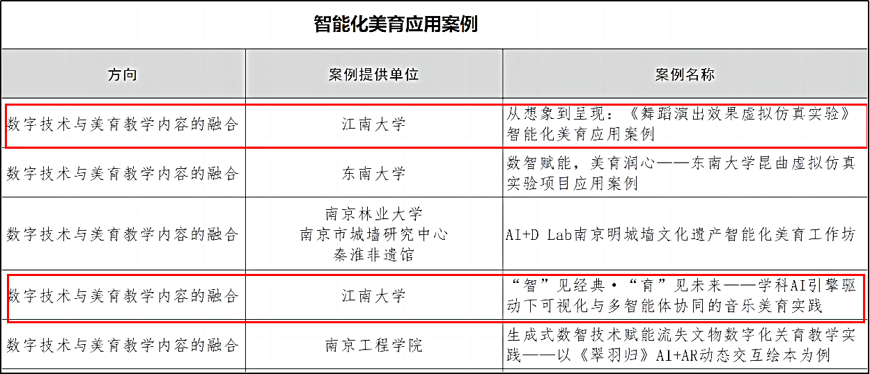 孙丝丝教授团队的《“智鉴经典·育见未来”——学科AI引擎驱动下可视化与多智能体协同的音乐美育实践》、侯侠老师团队的《从想象到呈现:<舞蹈演出效果虚拟仿真实验>智能化美育应用案例》入选智能化美育应用案例。